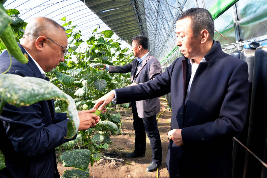 在边岗村扶贫项目大棚,张知众听取了大棚生产经验、销售途径、经济效益等情况的介绍。