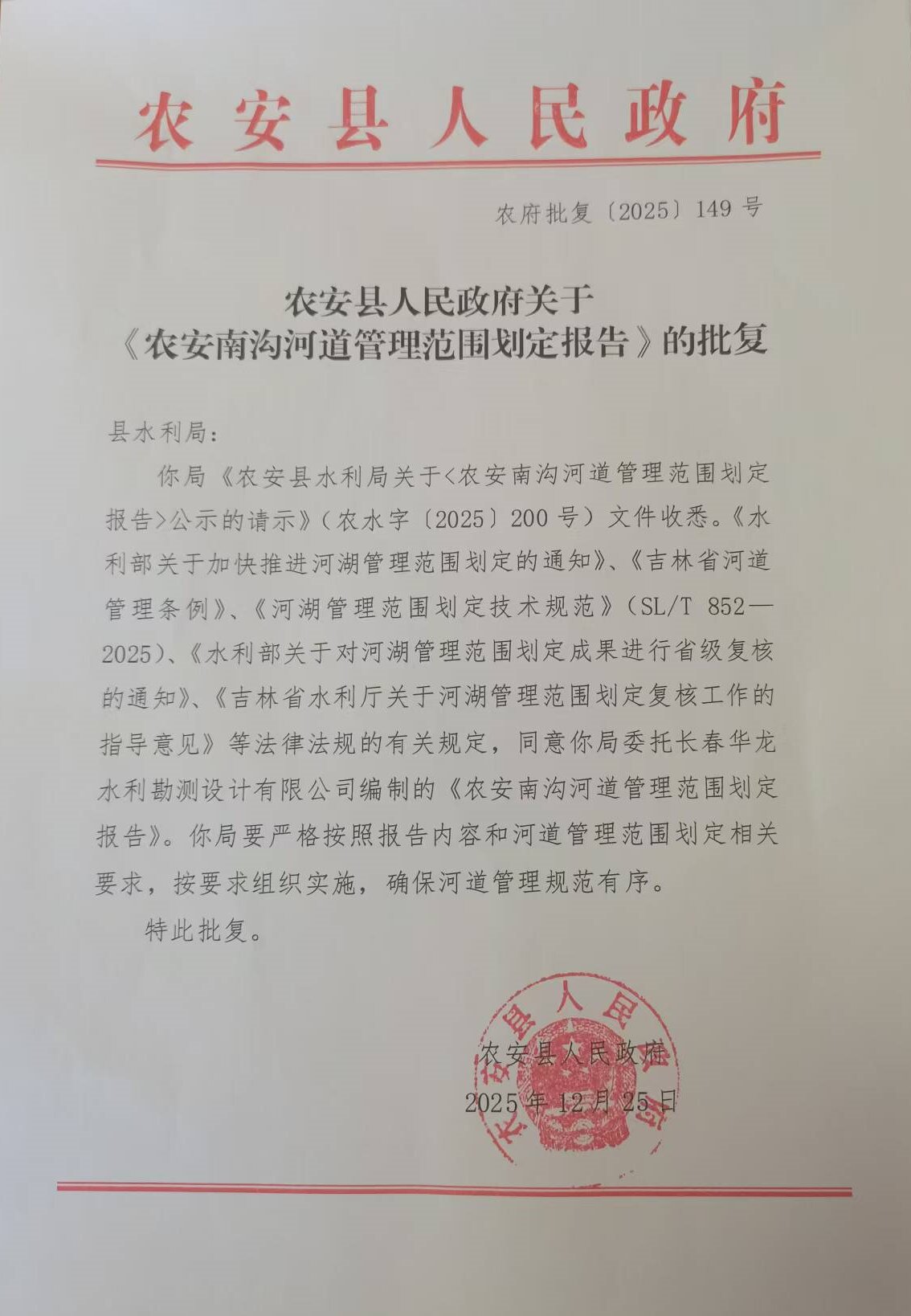 农安县人民政府关于《农安南沟河道管理范围划定报告》的批复