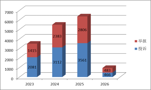 2023-2025年,辖区消费者投诉、举报量呈持续三年大幅上升态势,2026年截至当前(数据未完整统计)已受理投诉466件、举报483件,延续高位运行趋势: